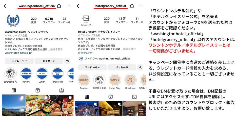 【注意喚起】ワシントンホテル/ホテルグレイスリー公式Instagramの偽アカウントにご注意ください